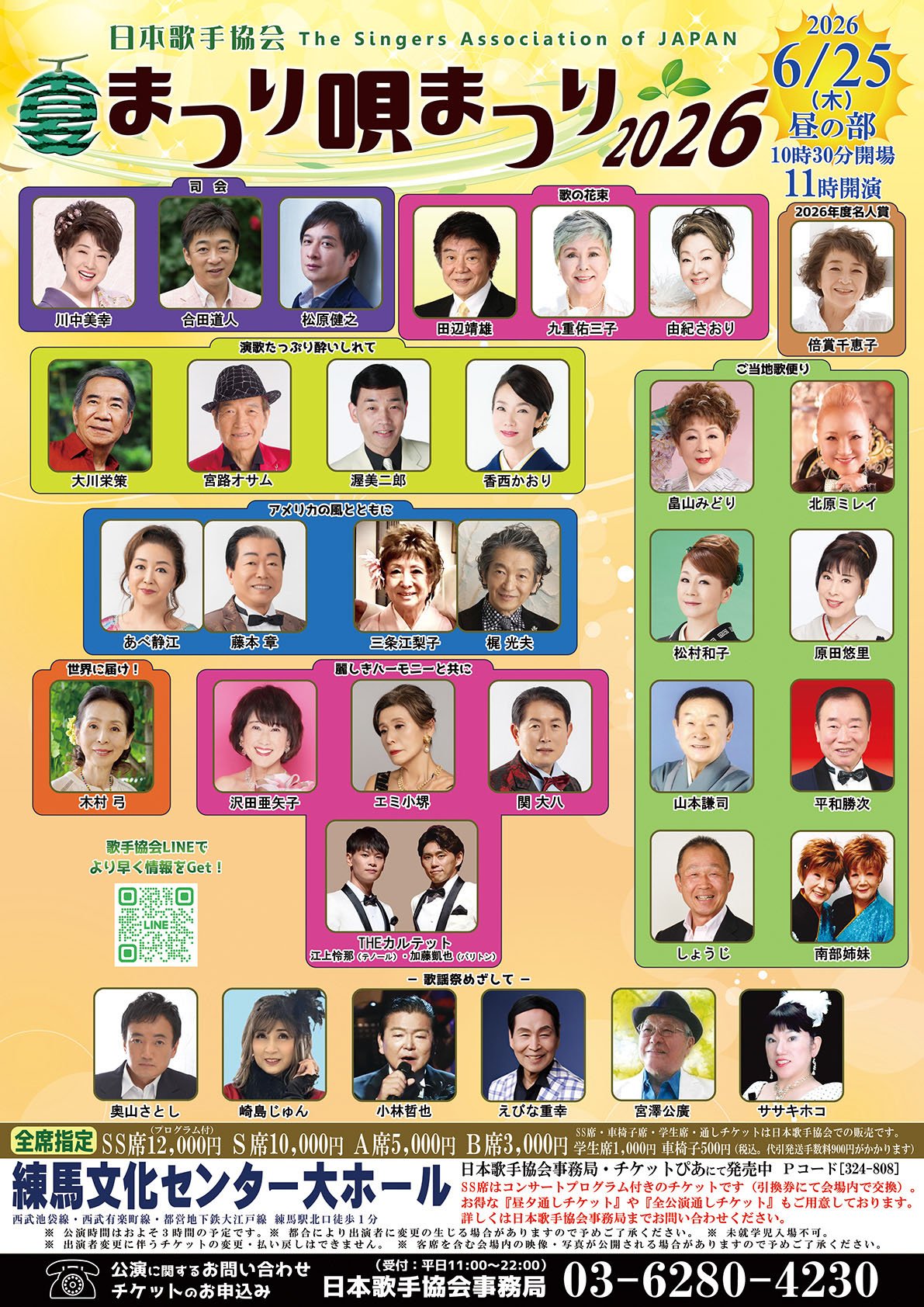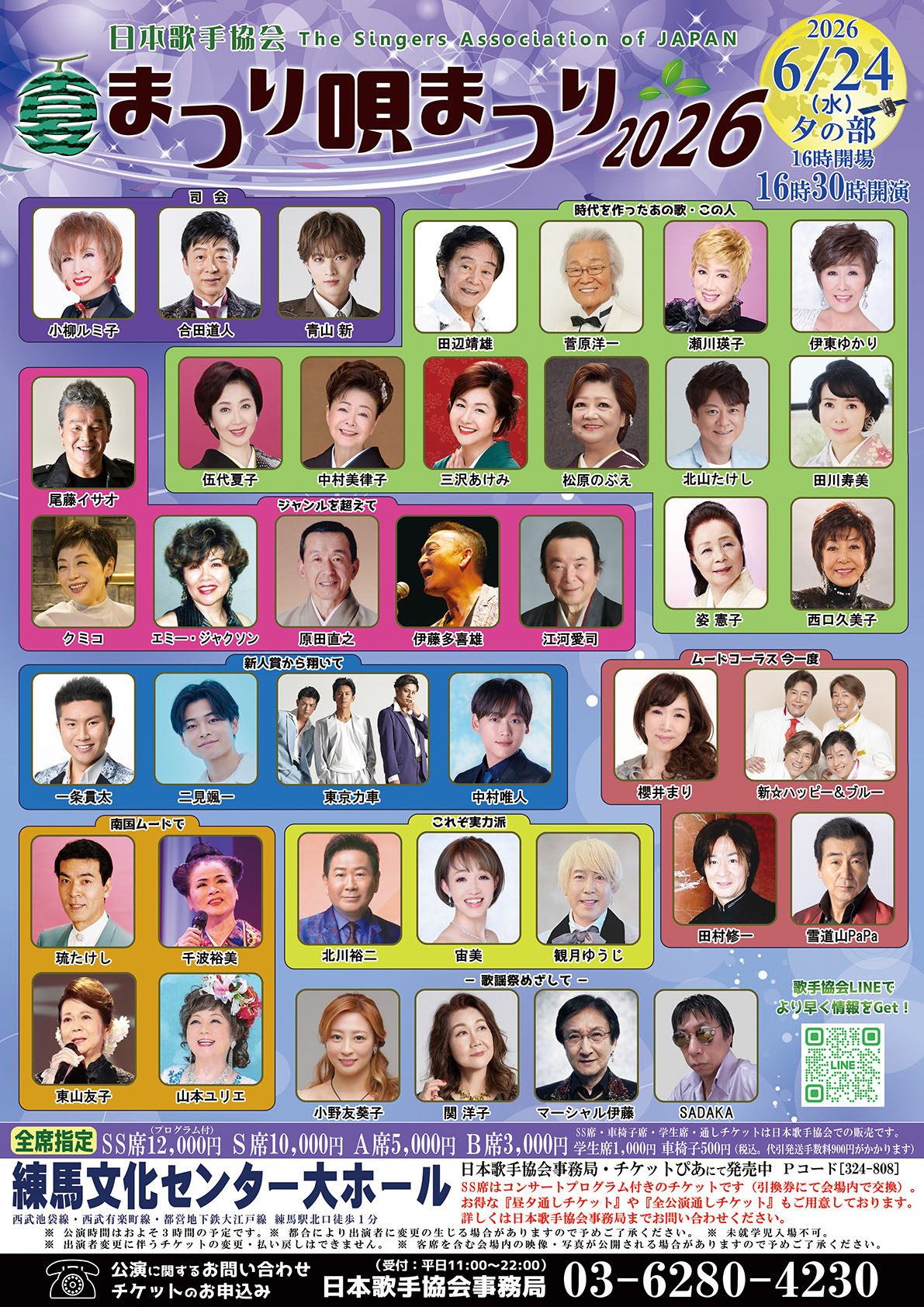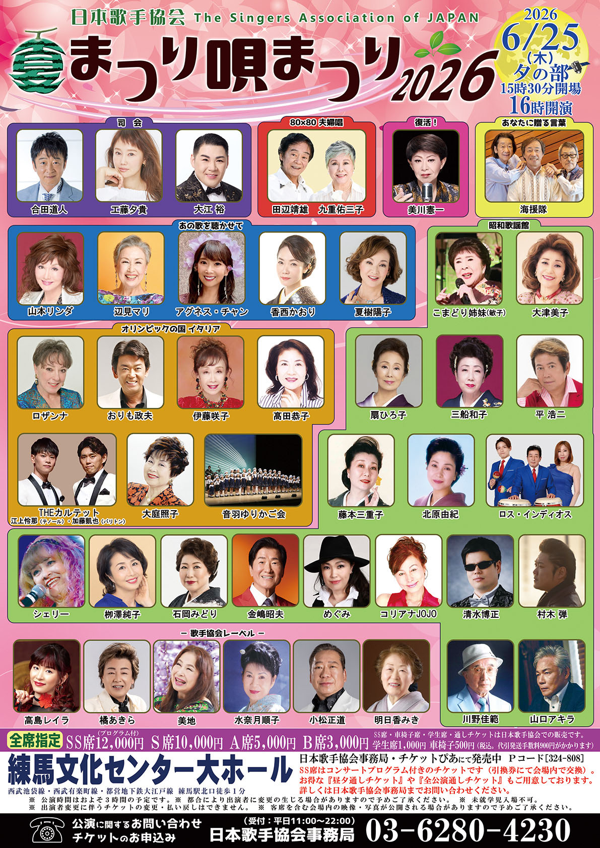 日本歌手協会は、6月24日夕の部、25日昼夕の部の計3回、3回ともに出演者、曲目をすべて変え、3回で100人以上のメンバーを集めて、東京・練馬文化センター大ホールで『夏まつり 唄まつり 2026』を開催ます。