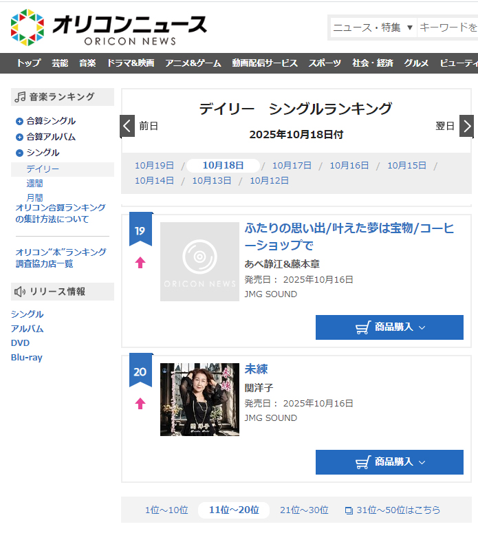 オリコンラン週間ランキング ランクイン!![]() 歌謡ポップスチャンネル放送決定! 「オリコン演歌・歌謡トップ30」 放送日 2025年06月16日(月) 16:00〜19:00 2025年06月17日(火) 6:30〜9:30 2025年06月18日(水) 12:30〜15:30 2025年06月19日(木) 6:30〜9:30 2025年06月21日(土) 13:00〜16:00 2025年06月22日(日) 9:30〜12:30 |