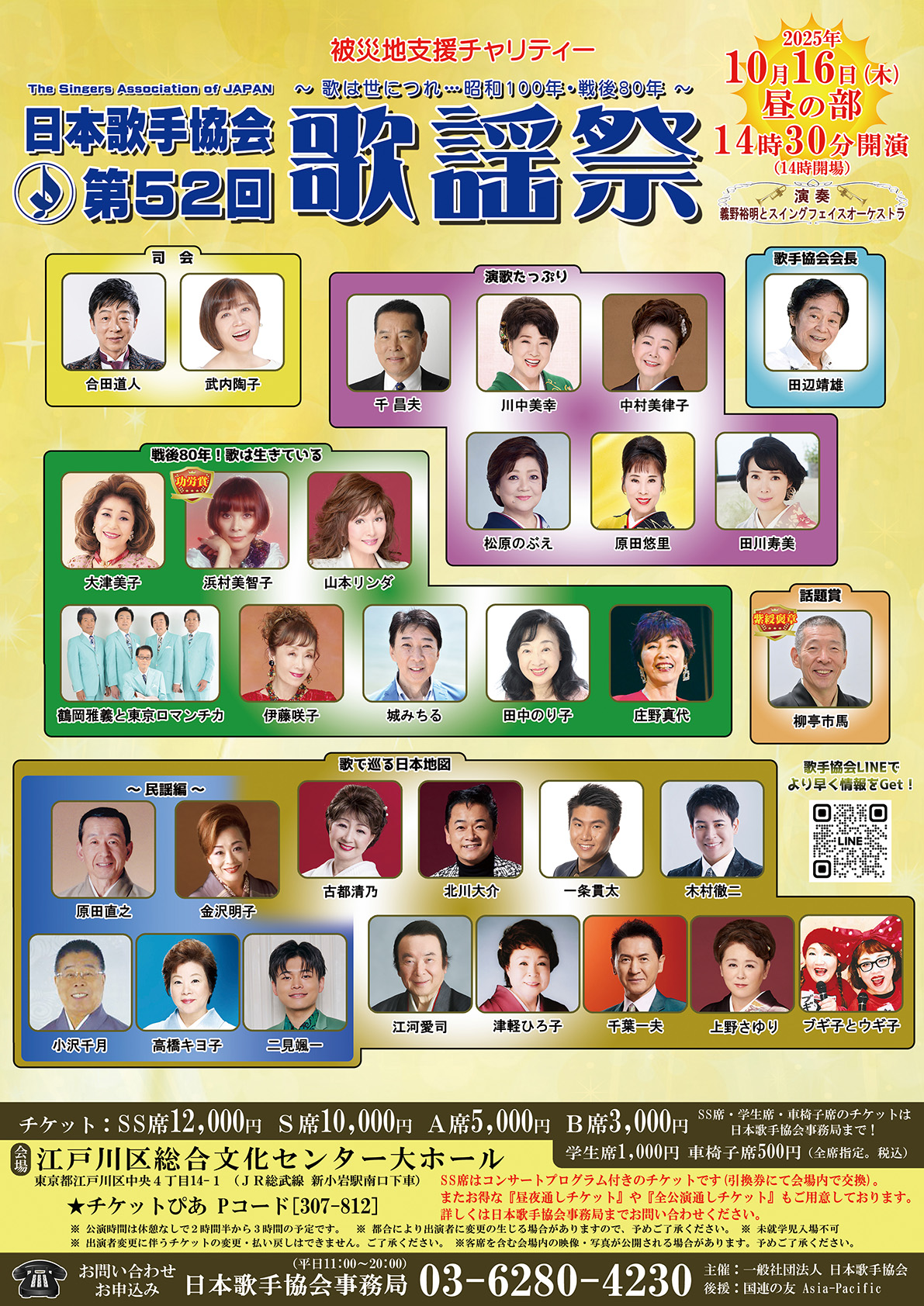 日本歌手協会事務局 03-6280-4230 (平日11時〜20時)